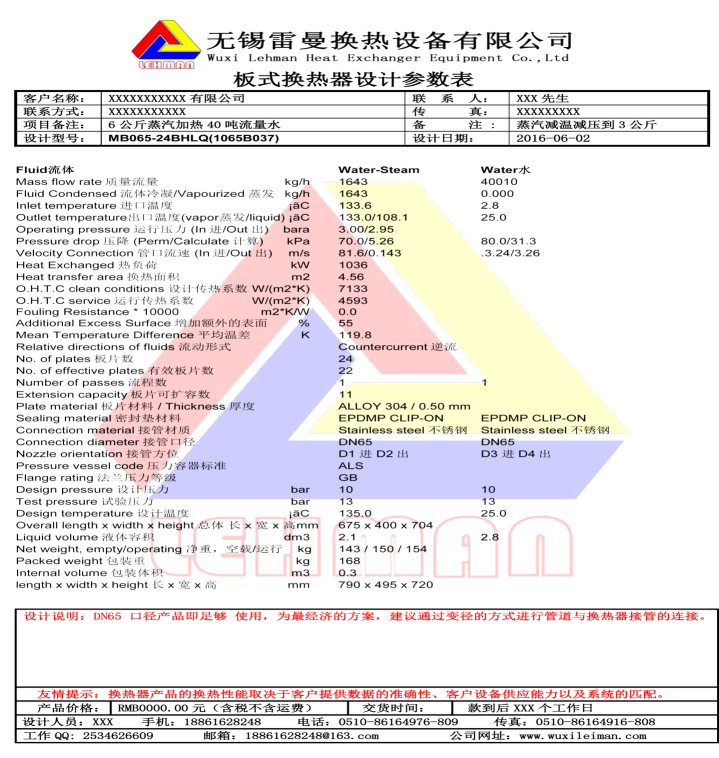 这两点注意能为您减少多损失!下面粉色视频观看高清免费完整先来教您如何看懂可拆式板式粉色视频在线下载选型参数表,以无锡粉色视频观看高清免费完整换热设备有限公司为客户出具的粉色视频在线下载选型参数表为例: